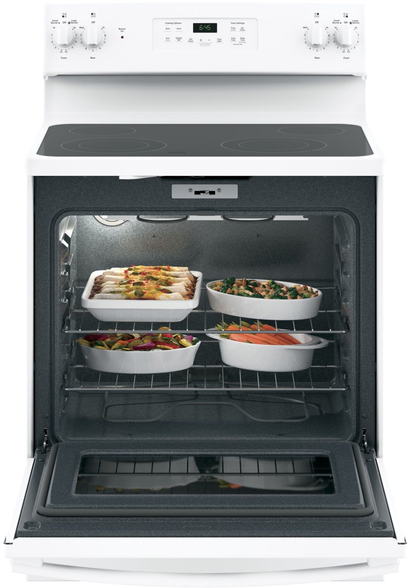 GE® 30" White Free Standing Electric Range with 5.3 cu. ft. total capacity, self clean oven and ceramic glass cook top